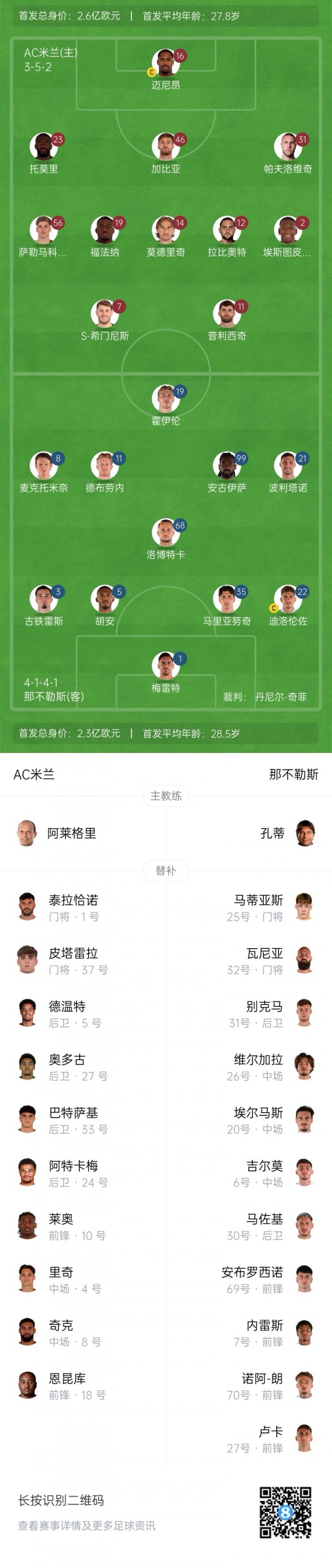 那不勒斯替補:25-馬蒂亞斯·費蘭特、32-瓦尼亞·米林科維奇、31-別克馬、26-維爾加拉、20-埃爾馬斯、6-吉爾莫、30-馬佐基、69-安布羅西諾、7-內(nèi)雷斯、70-諾阿·朗、27-洛倫佐·盧卡